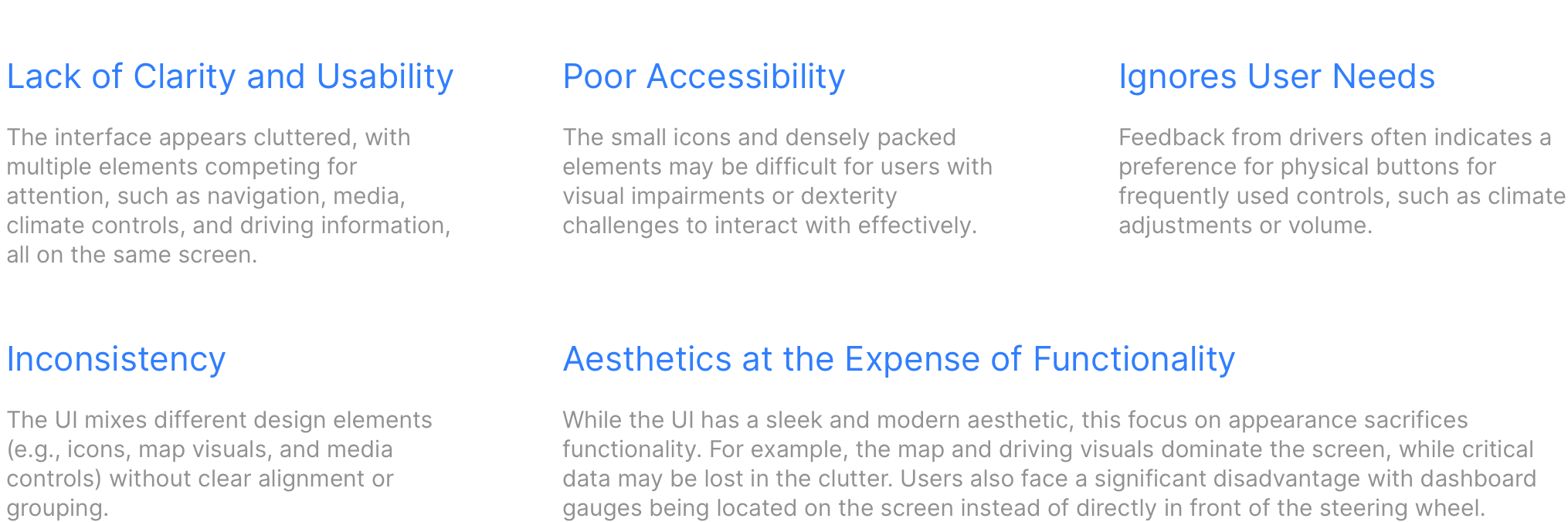 Well, not really. Bad design is everywhere, and the results of my research prompted me to explore the current interfaces in modern cars. After all, I had to understand what exacty the participants of my interviews were talking about! To do this, I chose to examine an example from the leading electric car manufacturer, Tesla. I conducted a detailed review of their design to identify its weaknesses, aiming to avoid similar pitfalls in my own work. To structure my analysis, I used the following guidelines to guide my review.