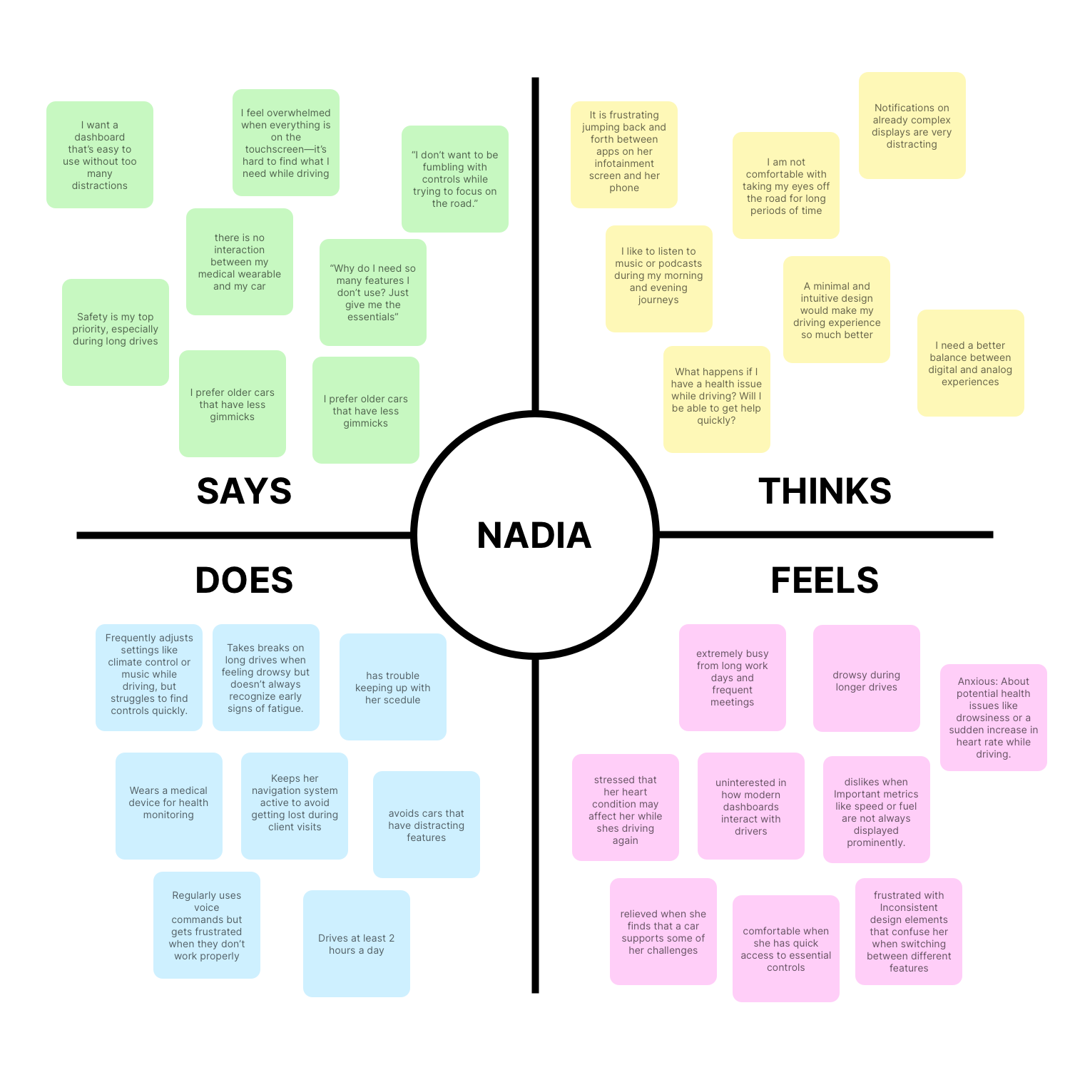I explored the current offerings from car manufacturers to shape my understanding of the existing landscape. Based on my experiences, I created early notes outlining key aspects I felt this project should represent. This helped me organise my thoughts before planning the interviews.
